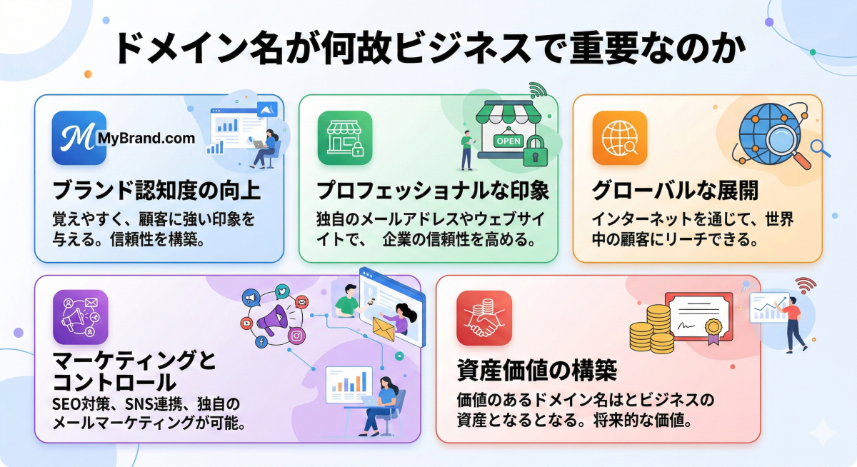 企業が独自のドメイン名を取得・運用することは、単なるインターネット上の住所確保にとどまらず、事業活動において多岐にわたる実務的なメリットをもたらします。図解に基づき、ビジネス展開においてドメイン名が重要となる5つの理由を解説します。
